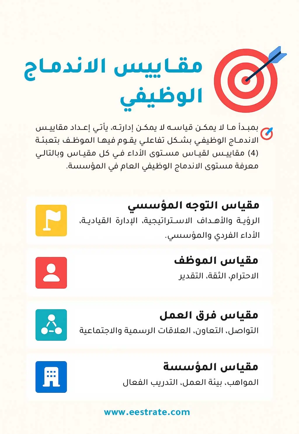 تُعد مقاييس الاندماج الوظيفي أداة فعالة لفهم مدى ارتباط الموظفين بمؤسستهم، وشعورهم بالانتماء والمشاركة في تحقيق أهدافها. تنقسم هذه المقاييس إلى أربعة أبعاد رئيسية تغطي الجوانب الجوهرية في بيئة العمل: التوجه المؤسسي، الموظف، فرق العمل، والمؤسسة. يساهم استكمال هذه المقاييس في تقديم تحليل دقيق لمستوى الاندماج داخل المؤسسة، مما يساعد على تحسين الأداء وتعزيز بيئة العمل بشكل مستدام.